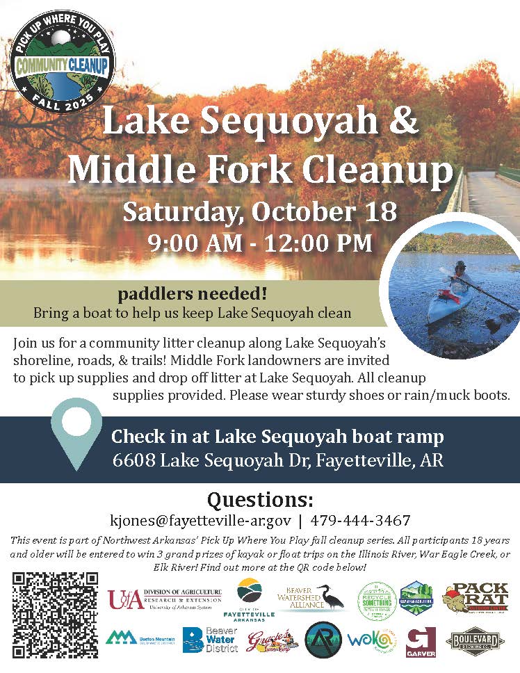 Saturday, Oct. 18 - Lake Sequoyah & Middle Fork Clean up in Fayetteville and Elkins, 9 a.m. - Noon. Float and land options. (Facebook event page here) (See flyer for more info.)