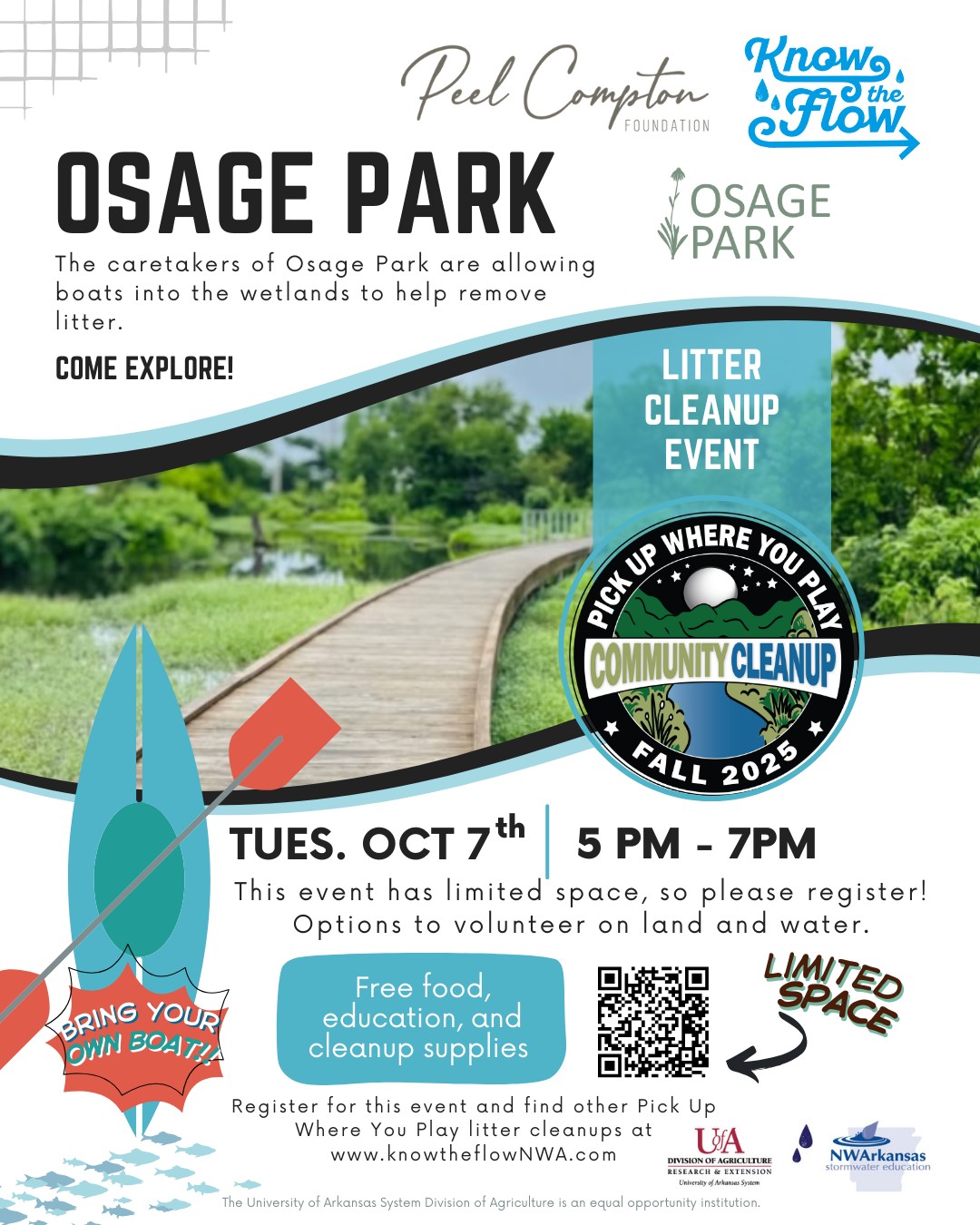 Tuesday, Oct. 7 - Wetlands at Osage Park, Bentonville - Bring your own kayak! 5-7 p.m. - Food provided. (Sign up here) (See flyer for more info)