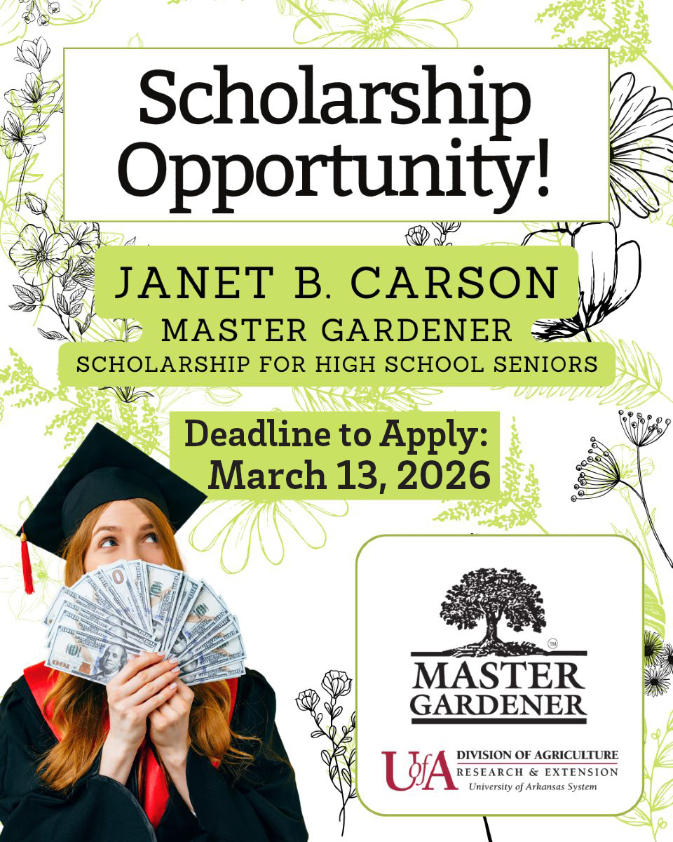 The scholarship is awarded annually by the County 76 Master Gardeners advisory group and named in honor of longtime Master Gardener Janet Carson, who was a horticulture specialist and Arkansas Master Gardener program coordinator for the Cooperative Extension Service, the educational outreach arm of the Division of Agriculture.