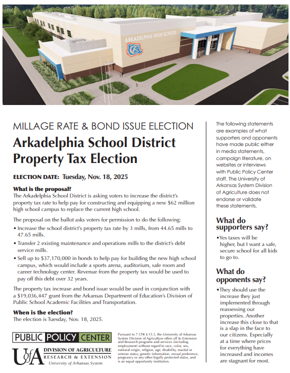 The Public Policy Center at the University of Arkansas System Division of Agriculture partnered with the Clark County Extension Office to produce a fact sheet explaining the bond issue and millage election.