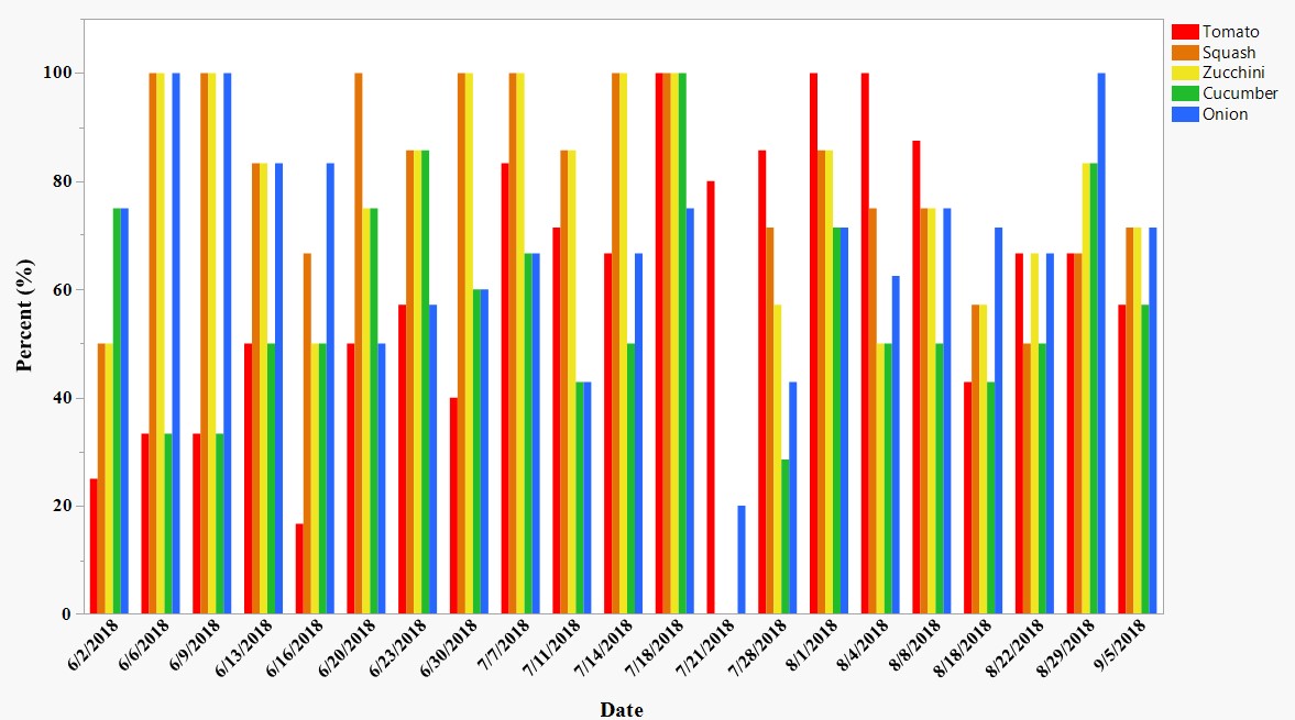 The percent of produce vendors at The Original Rogers Farmers Market selling the five most available produce items by week were evaluated (Fig. 1). The peak for tomatoes was from July 18-August 8 when more than 80% of vendors had tomatoes. All of the vendors (100%) had tomatoes on July 18th and August 1st, 4th, and 8th. There were many weeks where most vendors had squash and zucchini. All of the vendors (100%) had squash and zucchini on June 6th, 9th, and 30th and July 7th, 14th and 18th. From June 23-July 18 more than 85% of vendors had squash and zucchini at every market. All of the vendor had cucumbers on July 18th and had onions on June 6th and 9th and August 29th. From June 20-July 7, 60-70% of vendors at the market had cucumbers; and 65-100% had cucumbers August 8-September 5.
