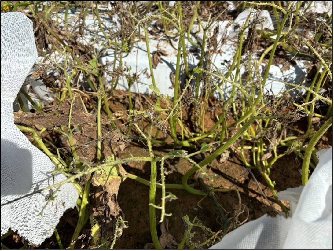 Picture 3. Pie pumpkins that have been completely defoliated by melonworm larvae in Hope, AR. These plants were originally covered by 2-ounce row covers to protect from melonworm infestation, however row covers broke down due to high moisture and heat in only a few weeks. Picture by Ryan Keiffer on 9/26.