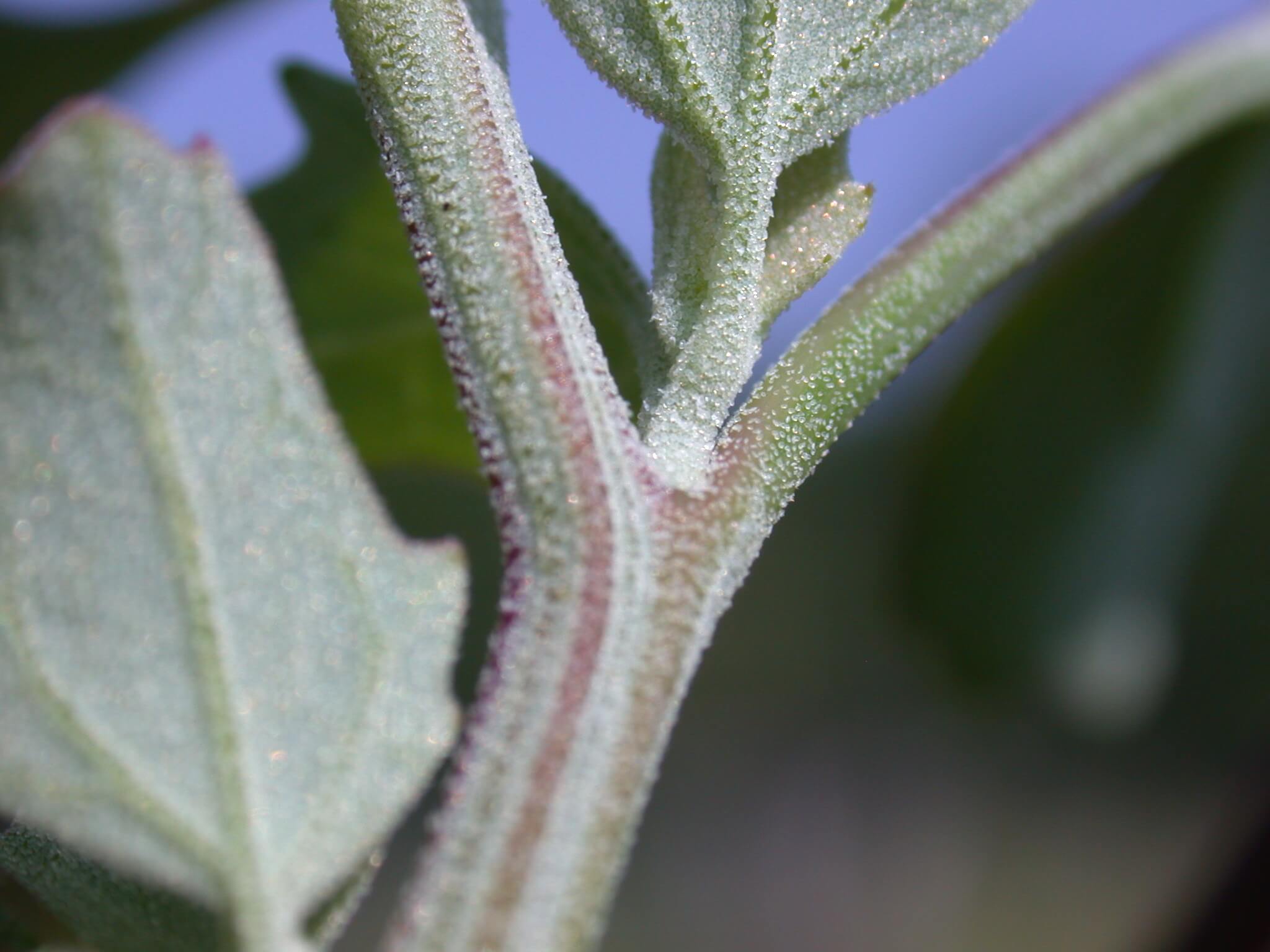 Lambsquarter leaves are small and dark green with purple-tinged edges.