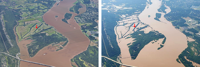 By June 2 more photos and videos were appearing online, showing details of the destruction. Things looked bad. The photo below on the left shows the normal water level at Two Rivers (maps.google.com). The photo on the right shows conditions on 6/2/2019 (photo by Michael Young). Red arrows indicate the location of the apiary.