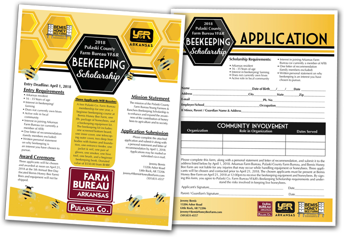 The Pulaski County Farm Bureau and Bemis Honey Bee Farm want to encourage three young adults to begin keeping honey bees by giving them everything they need to start right. The Young Farmer and Rancher Beekeeping Scholarship is open to all Arkansas resident (not just those in Pulaski County) with an interest in beekeeping, who do not already own honey bees.