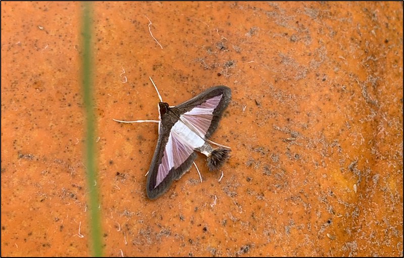 Melonworm moths have white, almost translucent, wings with a brown outline. Larvae are green caterpillars with two longitudinal, white stripes down their back and 4 sets of prolegs.