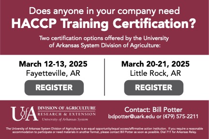 LITTLE ROCK — The University of Arkansas System Division of Agriculture will host two training events in March to familiarize new food processing workers with Hazard Analysis Critical Control Points. The system is considered the foundational food safety system in the United States.