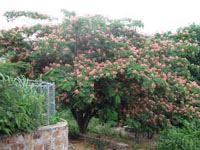 The 5- to 7-inch, fragrant, pink powderpuff of blooms appear in July. The mimosa is a member of the legume family; the flowers of this species are acacia-like and consist of numerous, long, showy stamens, not the more familiar pea-flower of the tribe. But when the seed pod develops, its membership in the legume family is obvious. The 6-inch long pods are filled with hard seeds.